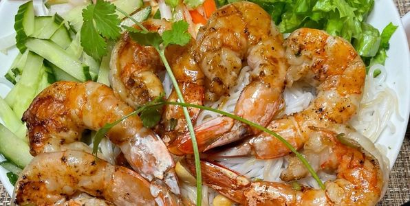 Combination of marinated grilled pork, chicken, beef and a crispy egg roll on a bed of vermicelli, bean sprouts, lettuce and cucumbers. Garnished with pickled carrots & daikon, crushed peanuts & scallions. Served with our house sauce.